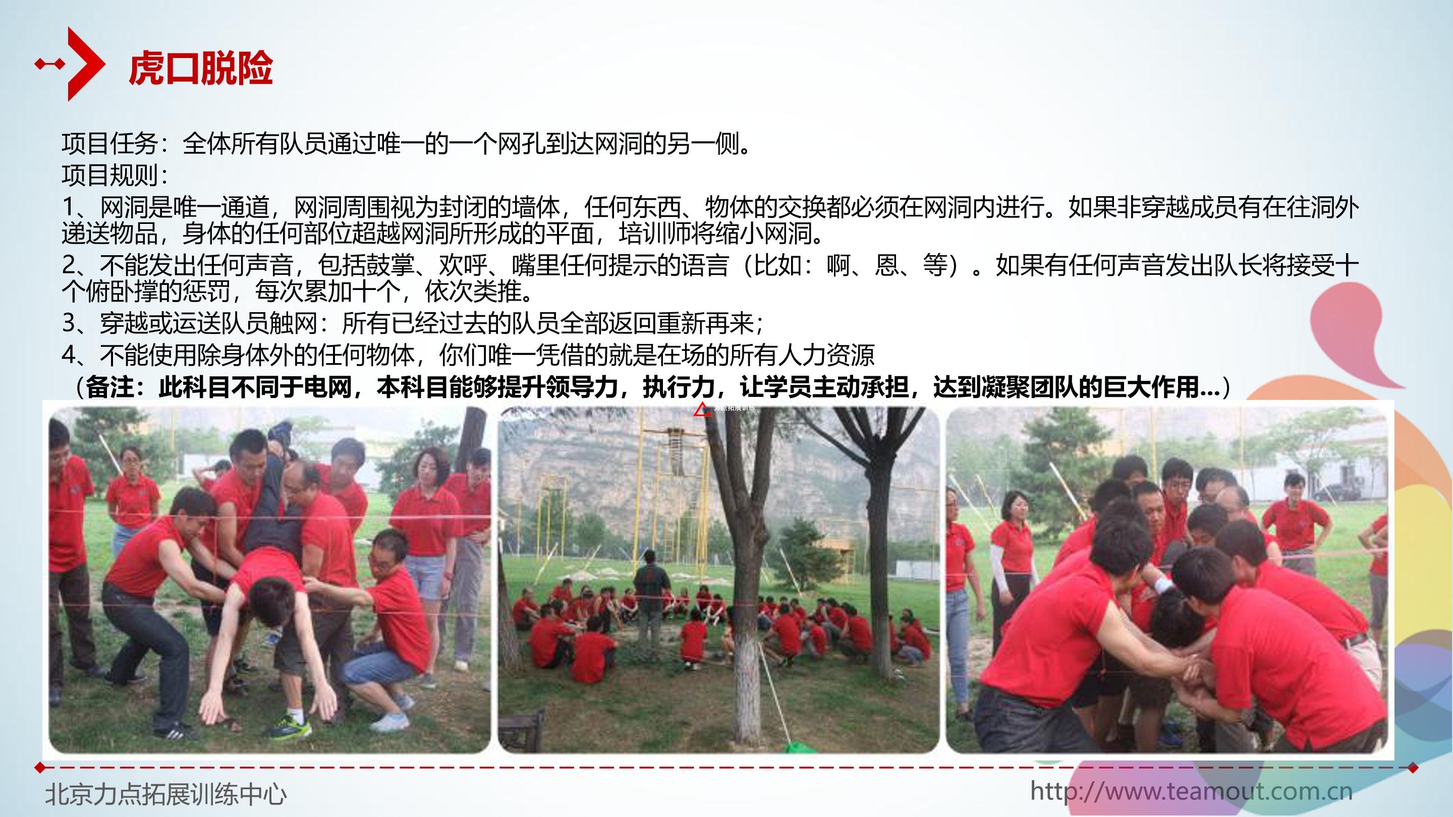 力點(diǎn)拓展訓(xùn)練公司一直堅(jiān)持學(xué)員心態(tài)改變訓(xùn)練的體驗(yàn)式培訓(xùn)模式,注重員工心理行為的變化。堅(jiān)持在體驗(yàn)中學(xué)習(xí),在學(xué)習(xí)中改變,在改變中成長(zhǎng)的培訓(xùn)理念,更好的為客戶創(chuàng)造更大的培訓(xùn)價(jià)值。